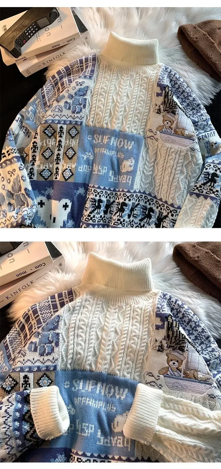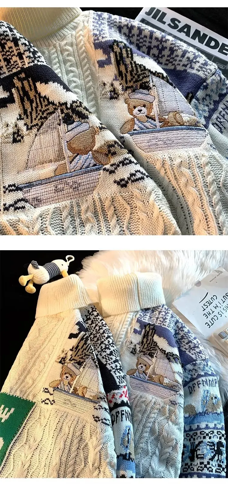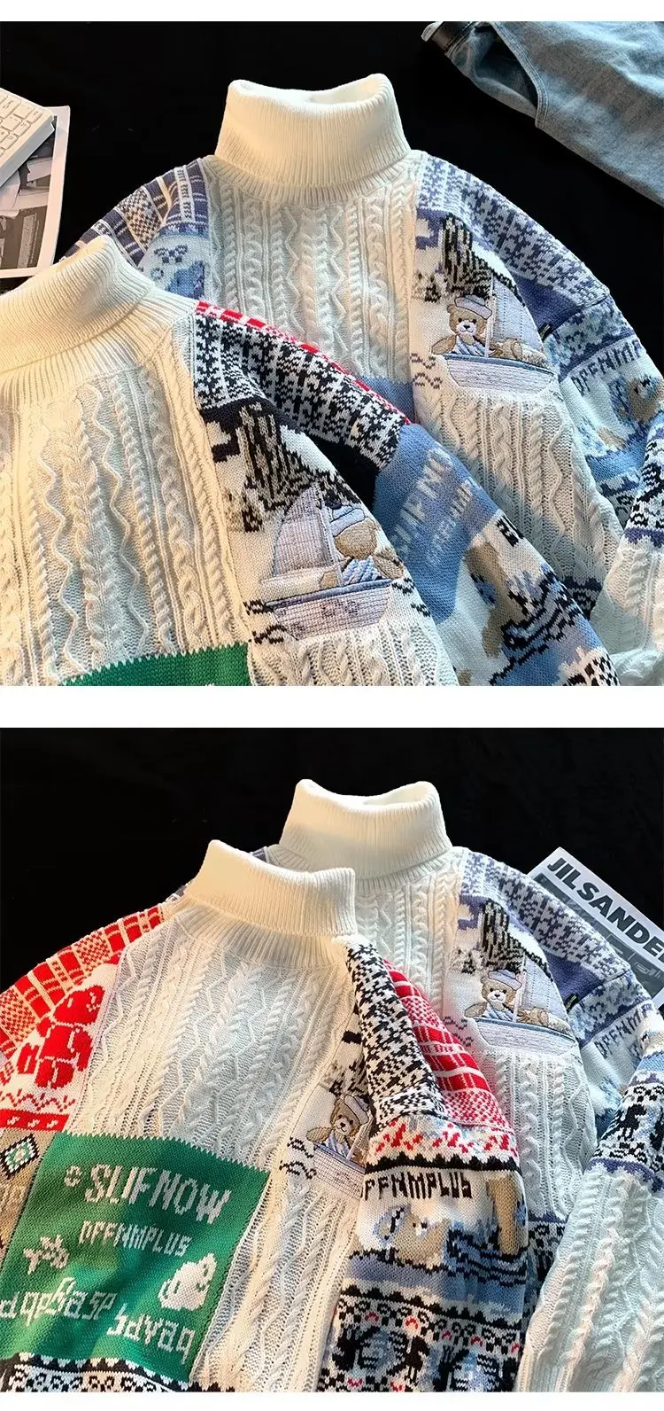ZAZOMDE Bear Knitted Turtleneck Sweater Men 2022 Winter Jumper Harajuku Cartoon Fashion Vintage Oversize Pullover Streetwear Men