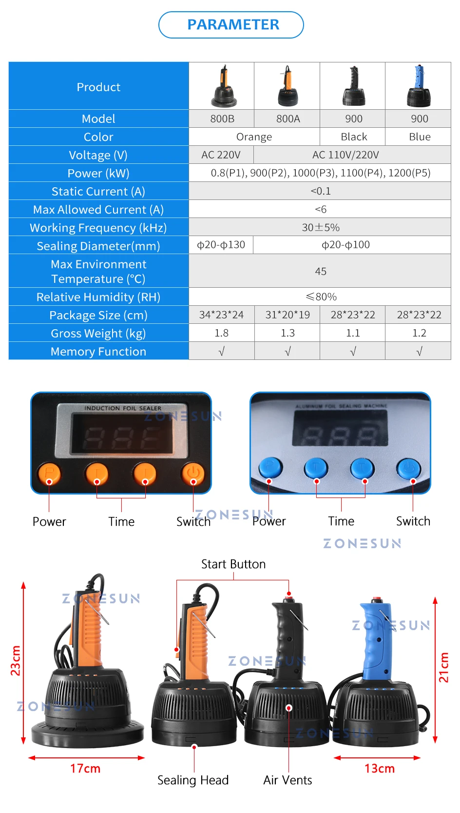 ZONESUN Handheld Induction Sealer Portable Electromagnetic Bottle Sealing Machine Aluminum Foil Lid Plastic Vial ZS-DL800